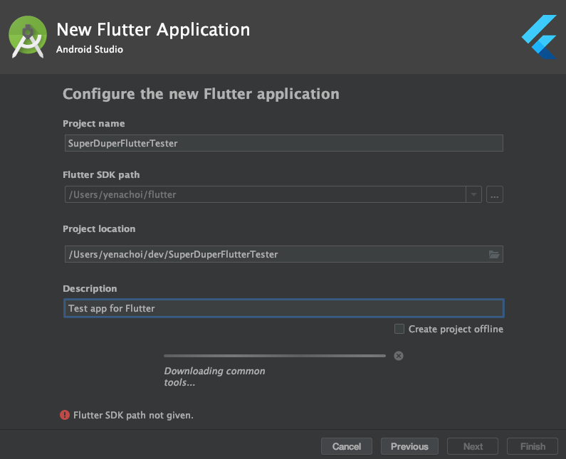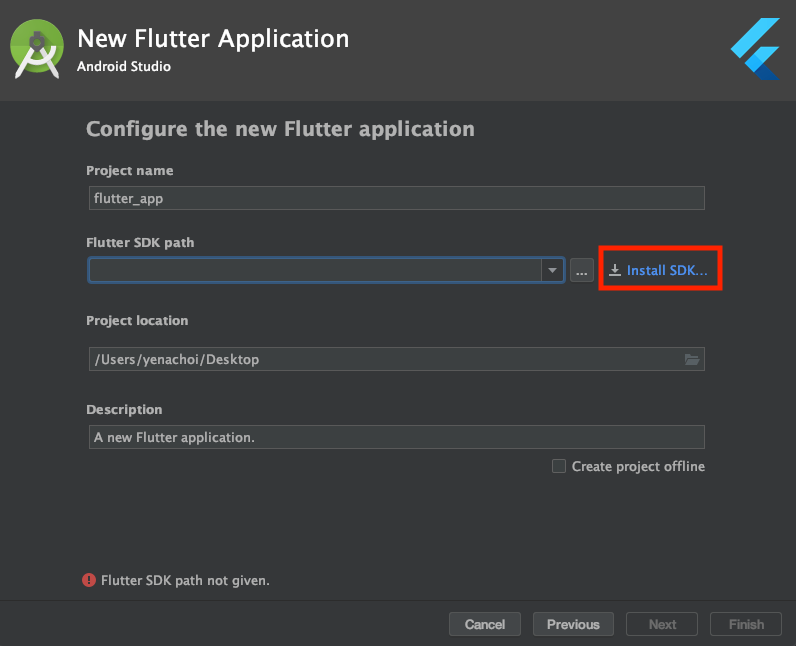 플러그인을 통해 설치해서 그런지, 내 컴퓨터에서만 그런지 Flutter SDK path가 제대로 잡혀있지 않았다. Install SDK를 통해 원하는 경로에 SDK를 설치해준다. 의외로 설치 시간이 꽤 걸린다. 체감 상 5분 정도 걸린 것 같다.
