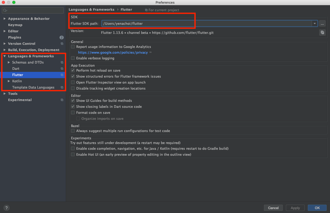 절망적으로 구글링해보니, 이 경우에는 IDE에서 SDK의 위치를 제대로 찾지 못한 것일 수 있다고 한다. Preferences - Languages & Frameworks 에서 Flutter SDK 의 패스가 제대로 들어가 있는지 확인해보니 빈 값으로 되어 있었다. 설치할 때 지정했던 Flutter SDK의 경로를 선택해준다. 버전 정보를 볼 수 있으면 성공. Dart는 Flutter의 하위 디렉토리에 있기 때문에 자동 설정되었다.