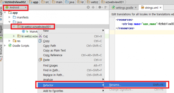 - 폴더를 복사하여 WzWebView002 를 만들었다. (만들때 이름은 맨앞에 영문은 대문자로.)